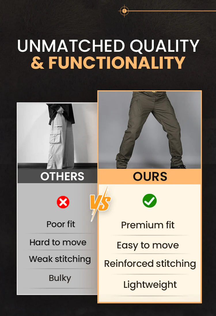 The image shows a side-by-side comparison of pants, with "OTHERS" depicted as having a poor fit, being hard to move in, with weak stitching, and bulky, while "OURS" are presented with a premium fit, easy movement, reinforced stitching, and a lightweight design, emphasizing the superiority of "OURS