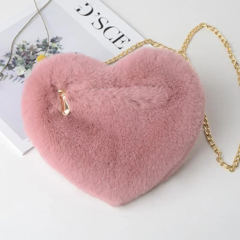 Faux Fur Heart Crossbody Bag, Cute Fluffy Chain Shoulder Purse for Women