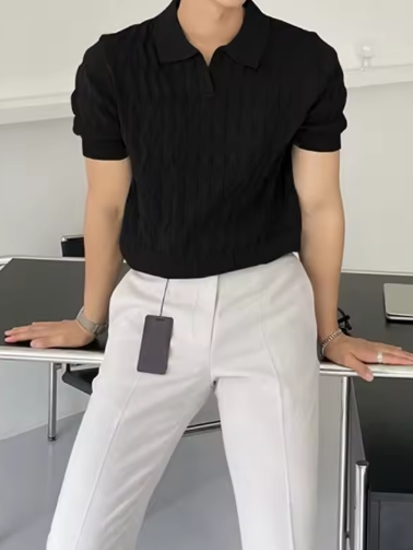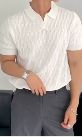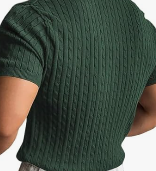The intricate cable-knit pattern adds a sophisticated touch to a classic short-sleeve top, making it perfect for both casual and semi-casual occasions.